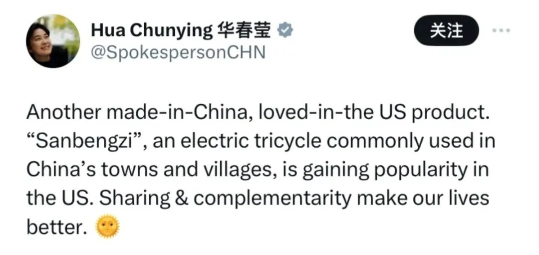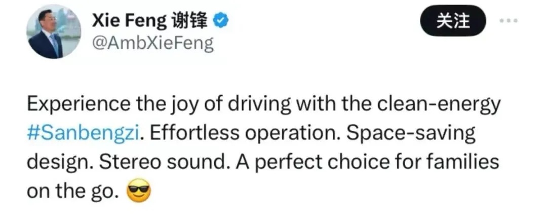 中国外交部副部长华春莹和驻美国大使谢锋也曾在国外社交平台上推介国产“三蹦子”。