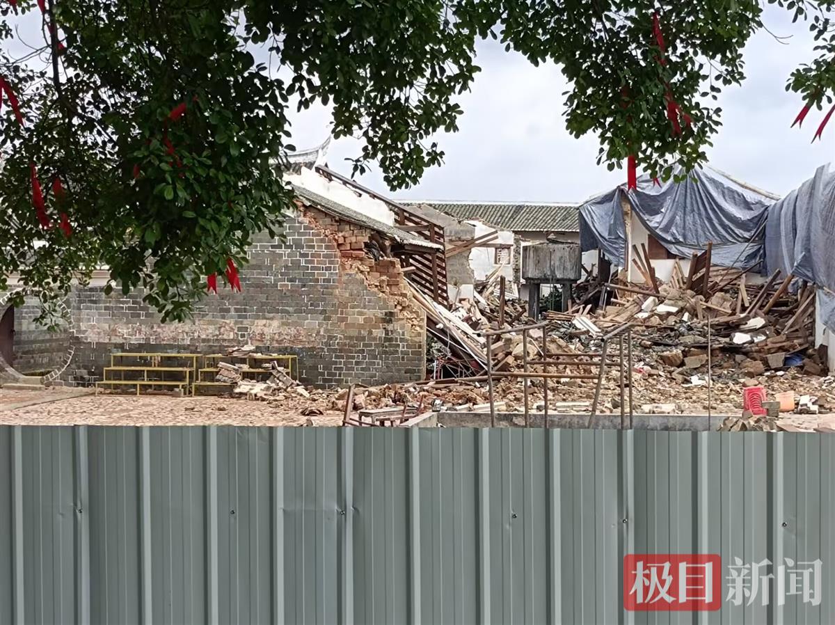 22日,极目新闻记者在现场看到,李氏大宗祠周围已经搭建起了围挡,有工人在进行清淤等工作,部分未倒塌的墙体也用防雨布等进行了遮盖。