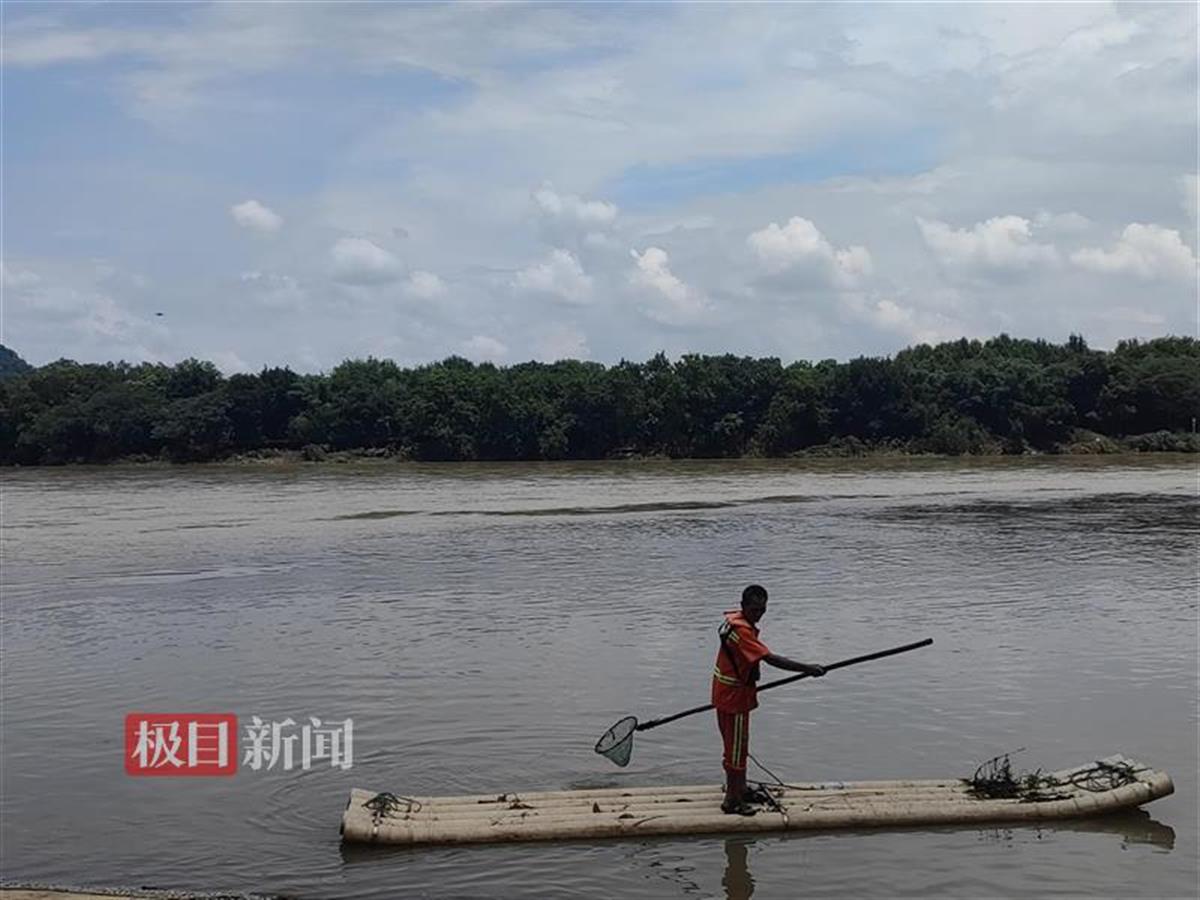 工作人员打捞江面垃圾