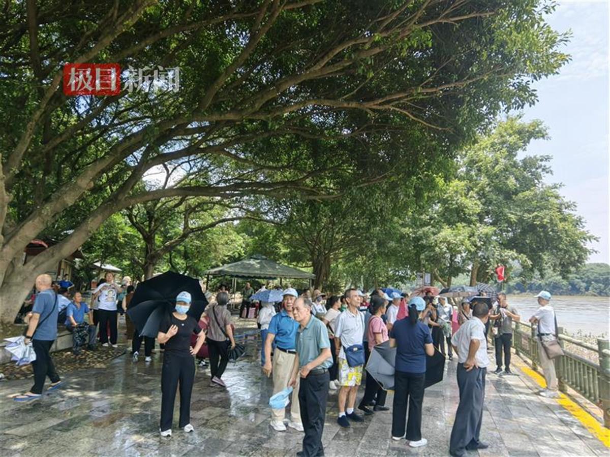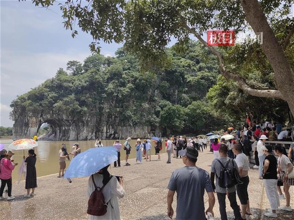 23日11时许,极目新闻记者在现场看到,象鼻山景区内早已迎来了一波又一波的旅行团游客,游客们争相在标志性景点象鼻山前留影。