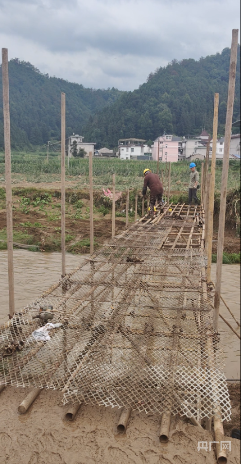 横跨濂溪河的一座石桥被洪水冲成了危桥。6月22日下午,记者看到村里正在用钢材架起临时桥梁,以供两岸通行。进村的主干道淤泥清理大半,进出村子的道路已经畅通。