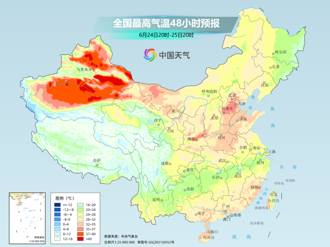 暴雨区之外,高温也正在发展。未来几天,华北、黄淮高温将频繁现身,其中24日高温范围短暂缩小,之后高温强度和范围又将增强、扩大。