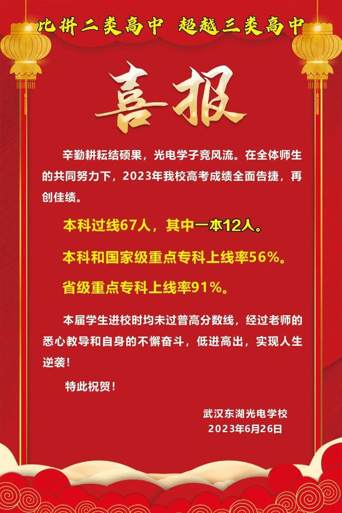 来光电,上本科,冲一本。武汉东湖光电学校是一所省级重点学校,实行全封闭式管理。学校坐落于东湖风景区吹笛山南麓,连接美丽的东湖绿道,比邻华中科技大学和陆军工程大学武汉军械士官学校,校园依山傍水,环境优美,教学及生活设施齐备。有一支职业道德好、教学经验丰富、教学能力强的教师队伍。学校凭借其卓越的教学质量和综合实力,于2008年被武汉市人社局评为市级重点学校;2015年,被湖北省人社厅评为省级重点学校。