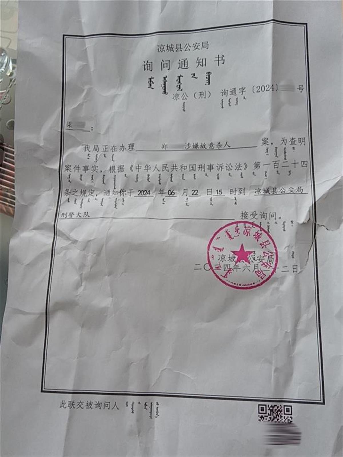 梁女士提供的一份凉城县公安局询问通知书显示,6月22日,凉城县公安局称该局正在办理郑某某涉嫌故意杀人案,为查明案件事实,通知梁女士弟弟到该局刑警大队接受询问。梁女士称,警方主要询问了母亲的个人信息,关于肇事车驾驶员及其他同乘人员等信息,警方表示正在侦查阶段,不便透露。