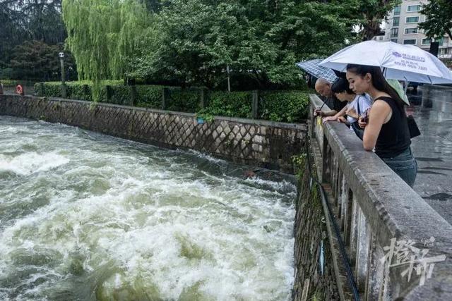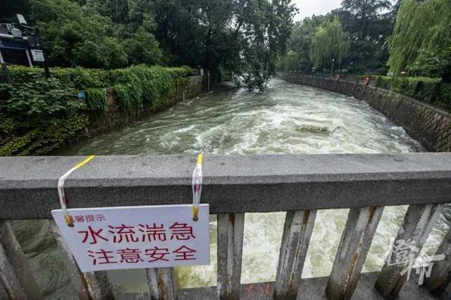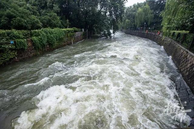 今天中午,橙柿互动记者在六公园附近的圣塘闸看到,三道闸门全部开放,水流奔腾而出,流入北山街北侧的古新河内,汹涌湍急。