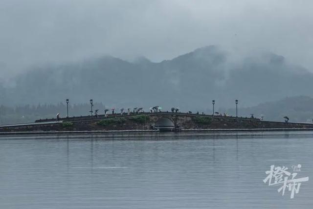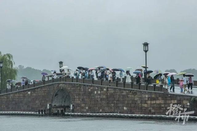 尽管雨很大,仍阻挡不住游客的脚步。断桥、白堤上,人们打着伞,冒雨欣赏烟雨朦胧的雨中西湖。
