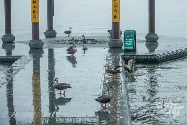 没有了平日的人来人往,西湖中的野鸭们竟把集贤亭“占领”了,一个个跳上栈道,大摇大摆地踱步,在亭子里休憩。