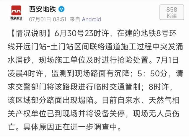 8点51分,西安地铁官方微博发布情况说明:6月30号23时许,在建的地铁8号环线开远门站-土门站区间联络通道施工过程中突发涌水涌砂,现场施工单位及时进行抢险处置。7月1日凌晨4时许,监测到现场路面有沉降;5:50分,请求交警部门将该路段进行临时交通管制;8时许,该区域部分路面出现塌陷。目前自来水、天然气相关产权单位已到现场并将设备关停,现场无人员伤亡。具体原因正在进一步调查中。