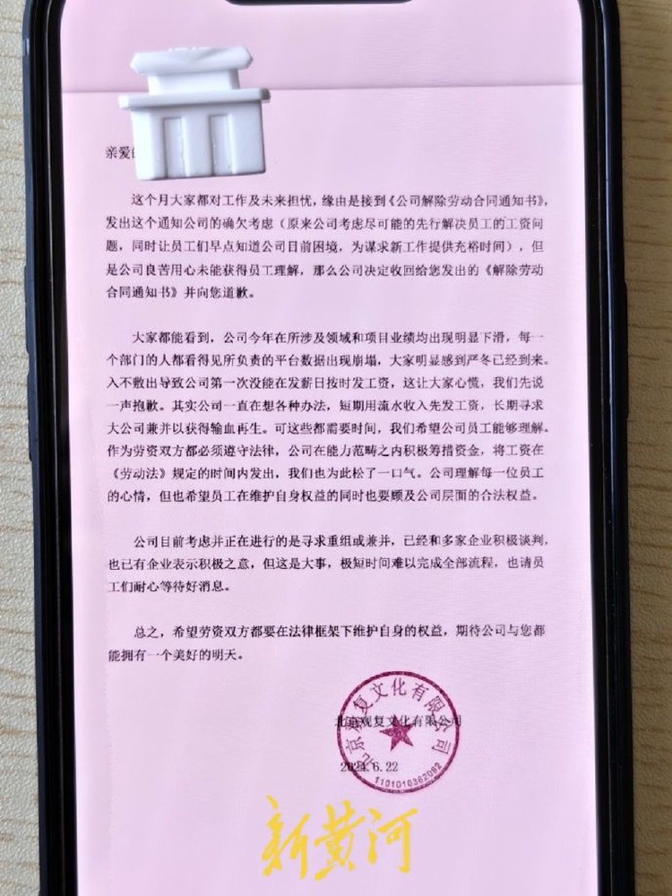 根据张先生提供的解除(终止)劳动合同通知书,也可以看到原因为:“客观情况发生重大变化”。但为什么会给大部分员工发送解除劳动合同通知,张先生也表示费解,不过随后公司又收回了部分解除劳动合同通知,更加令人不解。张先生提供的一份北京观复的说明显示:“这个月大家都对工作及未来担忧,缘由是接到《公司解除劳动合同通知书》,发出这个通知公司的确欠考虑(原来公司考虑尽可能先行解决员工的工资问题,同时让员工们早点知道公司目前困境,为谋求新工作提供充裕时间),但是公司良苦用心未能获得员工理解,那么公司决定收回给您发出的《解除劳动合同通知书》并向您道歉。”这份通知的落款时间为2024年6月22日。