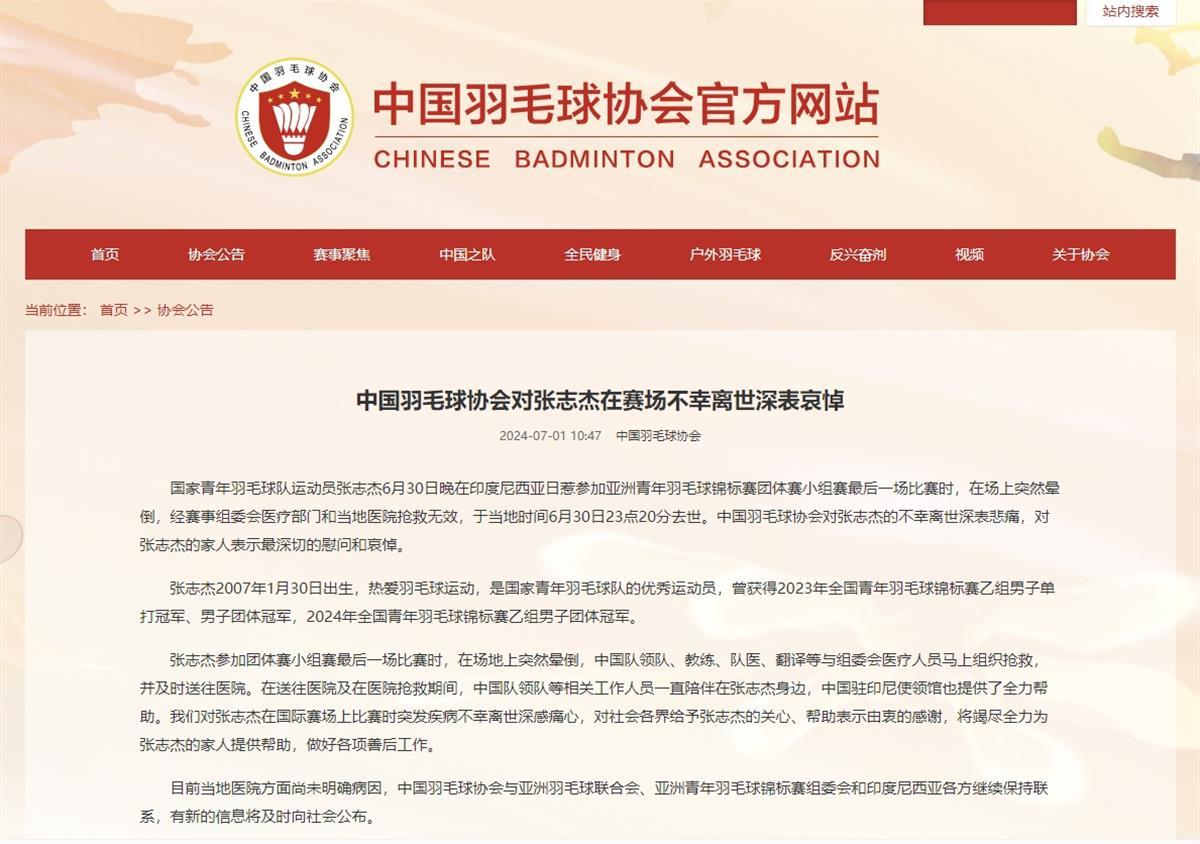 中国羽毛球协会对张志杰在赛场不幸离世深表哀悼(官网截图)