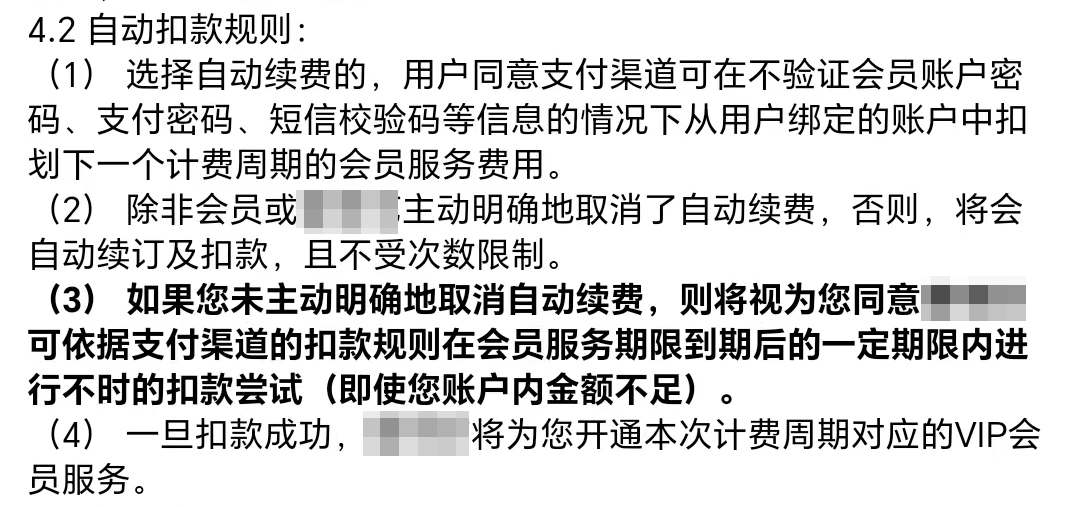 某视频平台则规定,对开通自动续费服务时的服务价格作出调整的,将会通过公告、站内信等一种或多种合理方式通知。如不同意自动续费服务价格调整的,可以按协议约定取消自动续费服务。多个平台提到,除非会员或平台主动明确地取消自动续费,否则,将会自动续订及扣款,且不受次数限制。