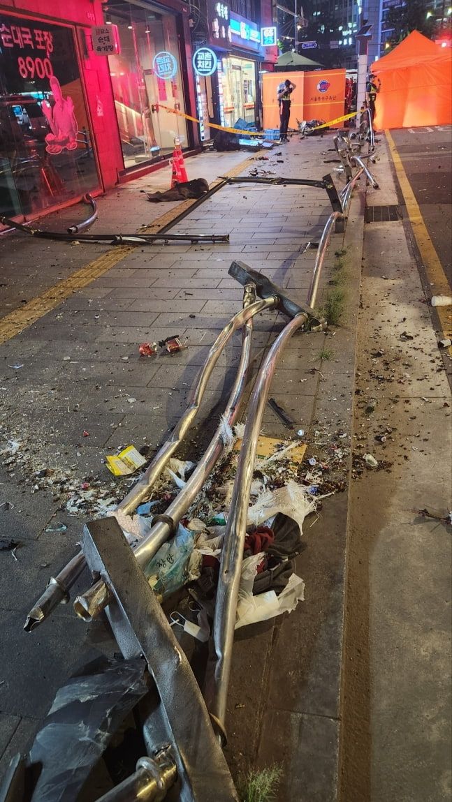 据报道,在该起事故中,分隔车道和人行道的铁制护栏从地面被撞拔起,附近商店的玻璃橱窗部分破损,玻璃碎片、商店里的物品等散落在道路上。