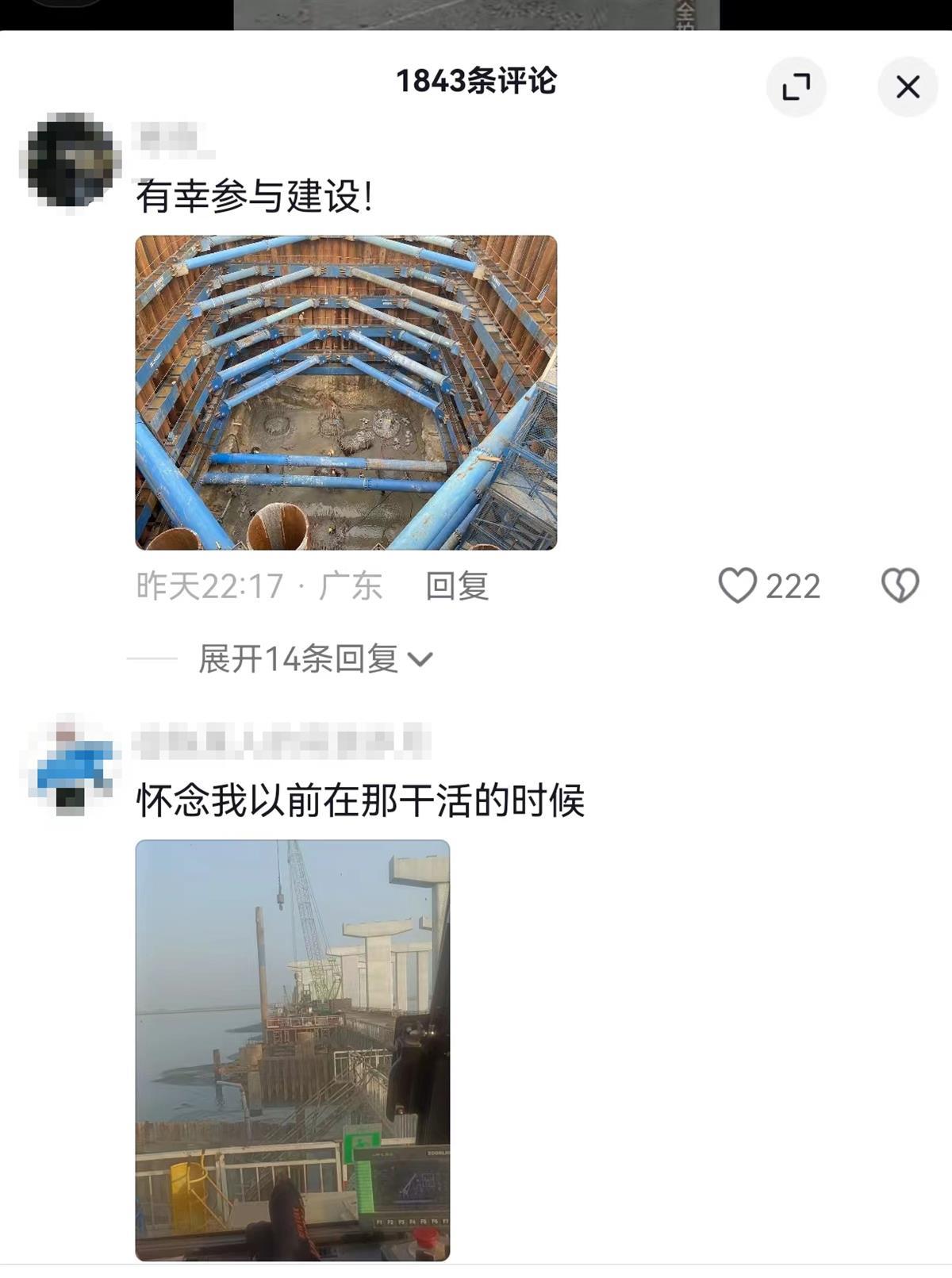 在不少有关深中通道视频的评论区,建设者纷纷晒出自己此前在项目施工现场拍摄的图片并配上文字。“想起之前在桥上装护栏的日子了”“我们做的主塔主缆项目,克服了狂风暴雨烈日曝晒,终于不负众望,完美交工”“时间过得好快,这是我们的摊铺机、压路机当年在桥上施工”。
