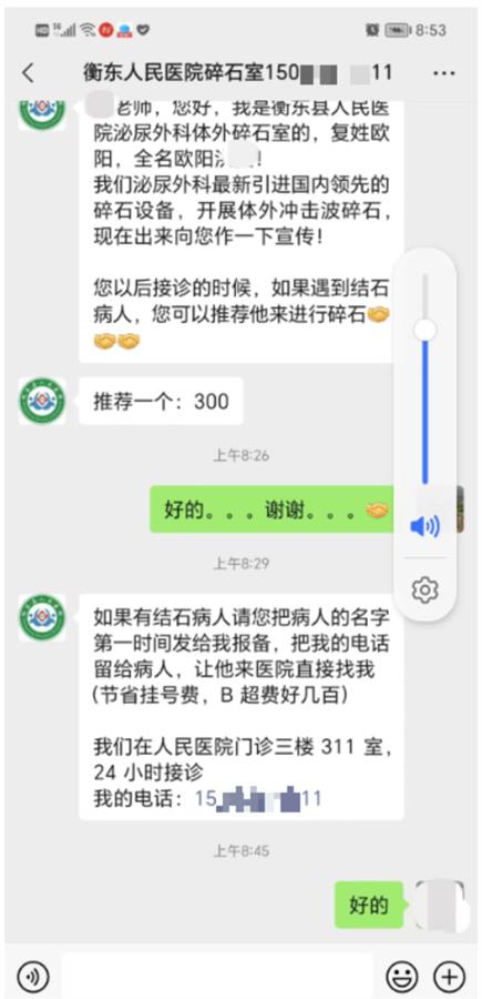 记者从该网帖附带的聊天记录截图中注意到,一名自称衡东县人民医院泌尿外科体外碎石室人员的欧阳某某,正在推销该院泌尿外科“最新引进国内领先的碎石设备”,并表示推荐一名结石患者到院进行碎石,就有300元奖励。此外,这位自称工作人员的欧阳某某还声称,如果有结石病人,可以直接找他,可以节省数百元的挂号费、B超费。在聊天截图的最后,欧阳某某还附上了科室的具体地址:人民医院门诊三楼311室,24小时接诊。