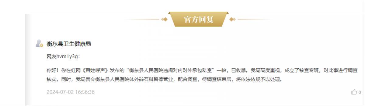 2日下午,衡东县卫生健康局回复网友hvm1y3g:你好!你在红网《百姓呼声》发布的“衡东县人民医院违规对内对外承包科室”一帖,已收悉。我局高度重视,成立了核查专班,对此事进行调查核实。同时,我局责令衡东县人民医院体外碎石科暂停营业,配合调查,待调查结束后,将依法依规予以处理。