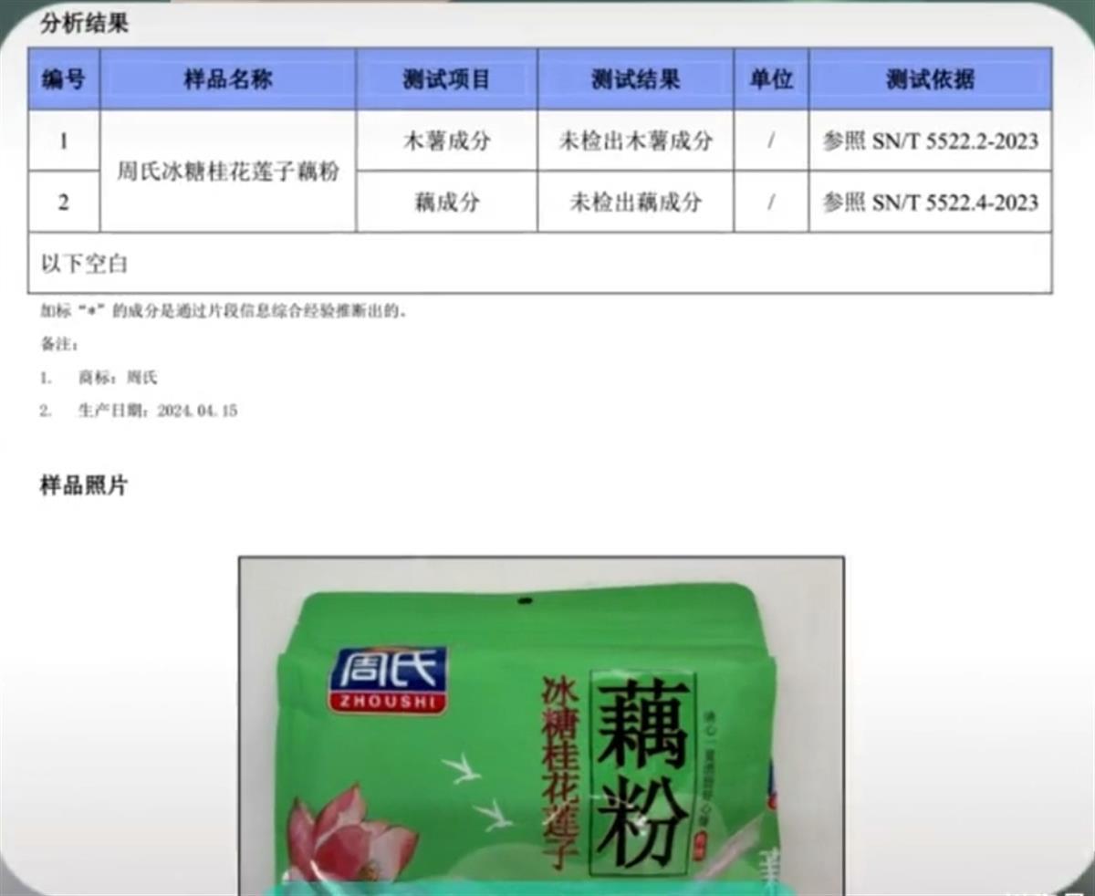 打假人王海在社交平台曝光称,桂林周氏顺发食品有限公司生产的周氏藕粉,经过送检发现居然未检出藕成分。2024年5月底,他们在“周氏自营旗舰店”购买了“冰糖桂花莲子藕粉”,并由自营旗舰店直接发往实验室进行检测,检测结果显示未检出藕成分。与此同时,他们在线下超市购买了“周氏纯藕粉”送到海关检测机构进行了检测,结果未检出藕源性成分。