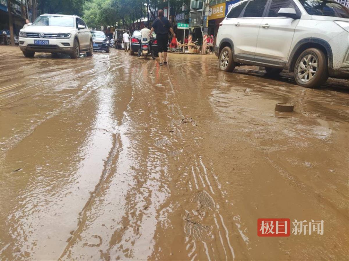在西街,大部分区域的积水已经退去,但在西街临近曲池路的路面上仍有数十米的路面有积水。西街一家单位的地下车库内也浸泡在积水中,附近多位商户提着桶来这里打水冲洗店铺。西街数百米长的路面上淤泥堆积情况较为严重,最深处超过十厘米,行人步行颇为困难。几名身穿马甲的志愿者正在帮一个商户清理其门口的淤泥。