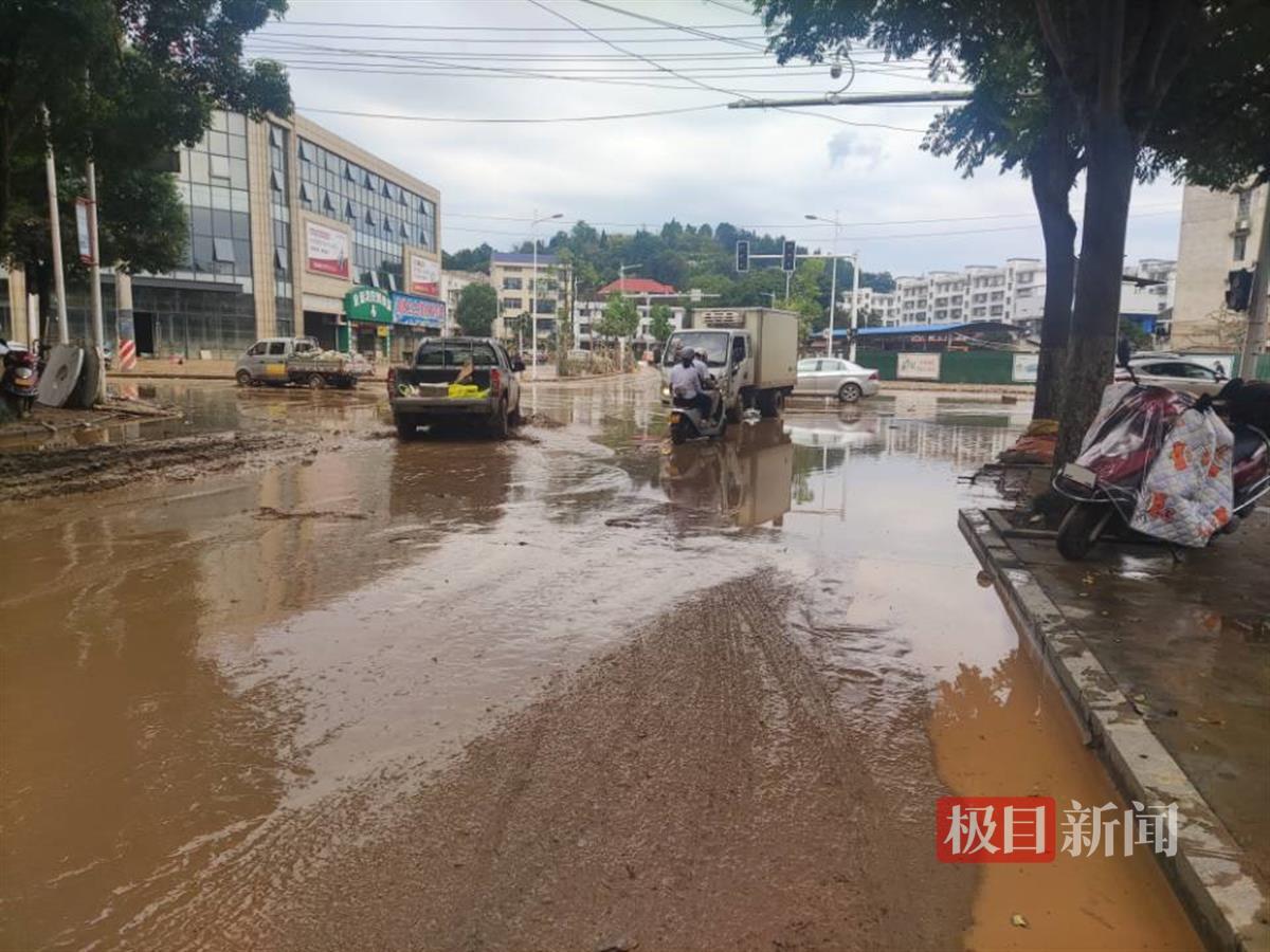 平江县城民建路曾被洪水围困,道路两边的上百家商铺全部被洪水浸泡,是县城受灾较为严重的区域。7月3日上午10时,极目新闻记者在这里看到,路面及商铺内的积水已经全部退去,但路面仍有大量淤泥,商户正在清理店内的淤泥和被水泡过的货品。