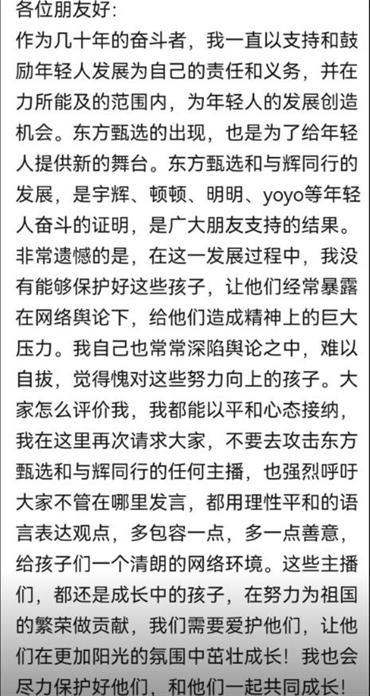 7月5日下午,新东方创始人、东方甄选CEO俞敏洪在其抖音账号上发布视频文章《请给年轻人更多的成长空间》,请求大家不要去攻击东方甄选和与辉同行的任何主播,“他们还是孩子,我没保护好。”