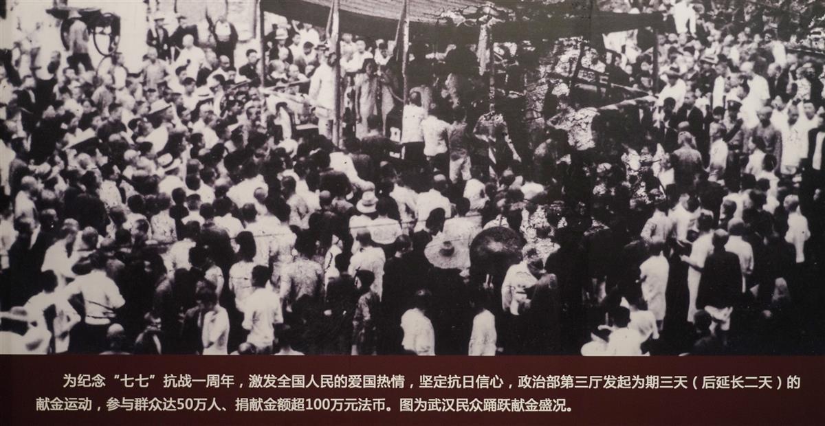 湖北省档案馆和八路军武汉办事处旧址的照片,展现了当时感人的场面:车夫、卖蚕豆的孩子、家庭妇女等都自发前来为抗战献金,有的将洗衣及种菜所得的微薄工资捐献出来,有的当场捐出订婚戒指。甚至还有流浪的乞丐,拄着拐杖的难民,将仅有的几分钱投入捐款箱。《新华日报》用极富画面感的描述报道了人民群众满腔爱国热情、为抗日献金的盛况:1938年7月7日至10日,武汉三镇民众络绎至各献金台,踊跃捐款救国,一时间万人空巷。