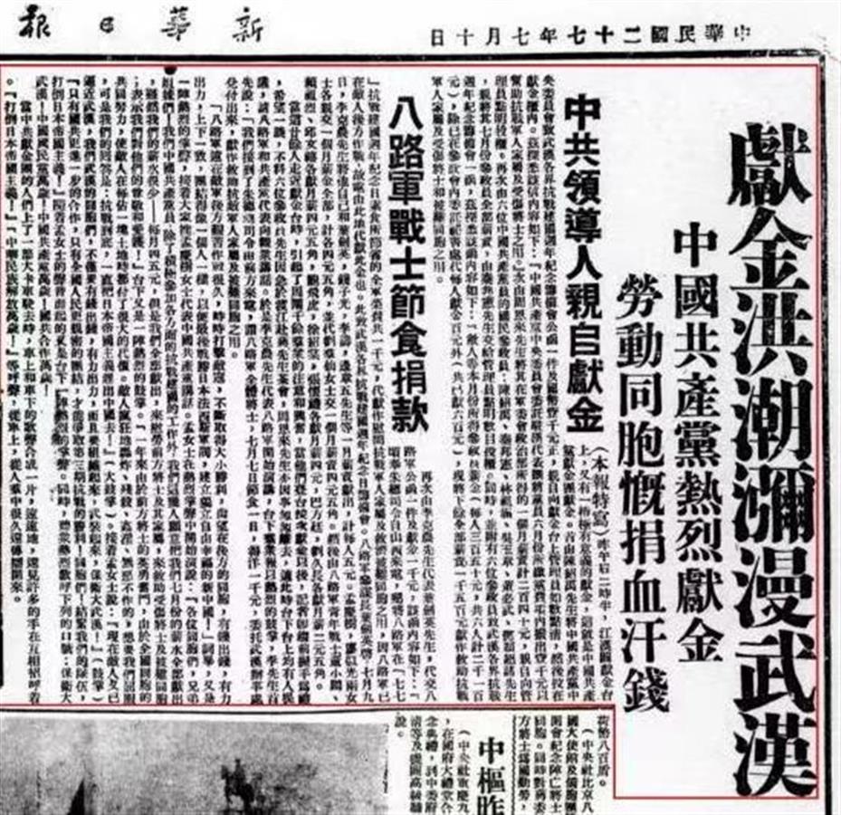 1938年7月2日,《新华日报》刊登了各界组织的献金活动,在1938年七七事变一周年纪念日的当天,《新华日报》发文动员民众踊跃献金支持抗战。通过一系列抗日献金活动,中国共产党的宣传将民众的抗日热情推向高潮,民众纷纷解囊支援抗战,保卫武汉。在7月10日的报道中,《新华日报》使用了大字标题来突出中国共产党方面对献金以支援抗战的重视,以“中国共产党领导人亲自献金”和“八路军战士节食捐款”作为副标题,宣传中国共产党领导的抗日献金活动。7月12日,《新华日报》以社论《民众献金运动》总结了此次七七事变周年纪念、支援抗战的献金活动,强调“此次武汉及全国各地民众热烈献金运动,表现了我全国同胞的忠勇及拥护政府长期抗战的伟大力量……用全民族的力量争取抗战的最后胜利”。
