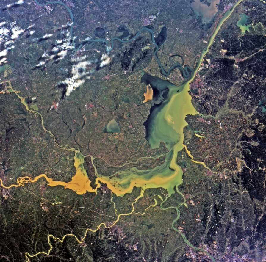 下图为岳阳市华容县及周边受灾前后,中国资源卫星应用中心紧急调度在轨卫星,用高分三号卫星、高分四号卫星观测的图像对比图,从中可以看出华容县严重被淹,受灾严重。