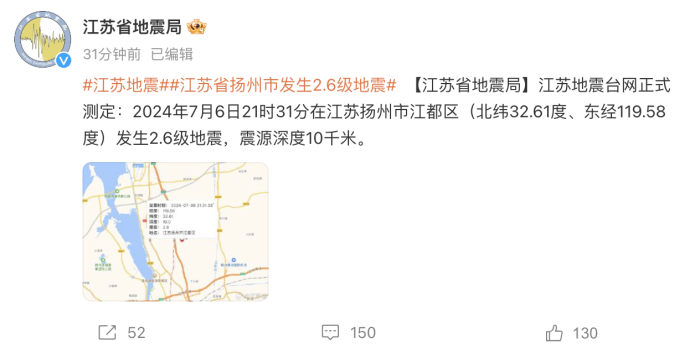 江苏地震台网正式测定:2024年7月6日21时31分在江苏扬州市江都区(北纬32.61度、东经119.58度)发生2.6级地震,震源深度10千米。