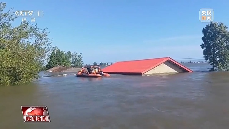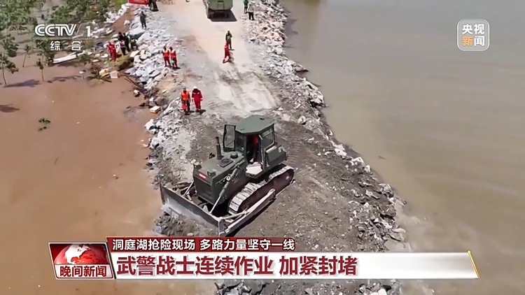 在湖南岳阳市华容县团洲垸洞庭湖一线,武警、民兵、消防、电力人员坚守岗位、冲锋在前,全力开展抢险救援工作。