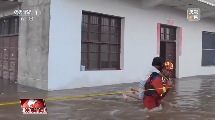在一栋民房内,救援人员看到,三名老人和一名10岁女孩被困在二楼,房屋一楼已经被淹。消防员迅速转移被困人员。