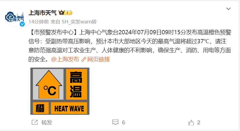 据@上海市天气消息,上海中心气象台2024年07月09日09时15分发布高温橙色预警信号:受副热带高压影响,预计本市大部地区今天的最高气温将超过37℃,请注意防范强高温对工农业生产、人体健康的不利影响,确保生产、消防、用电等方面的安全。