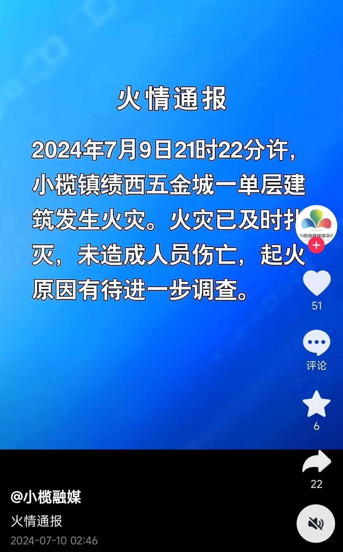 据小榄镇融媒体中心7月10日凌晨2时许消息,7月9日晚9时22分许,小榄镇绩西五金城一单层建筑发生火灾。火灾已及时扑灭,未造成人员伤亡,起火原因有待进一步调查。