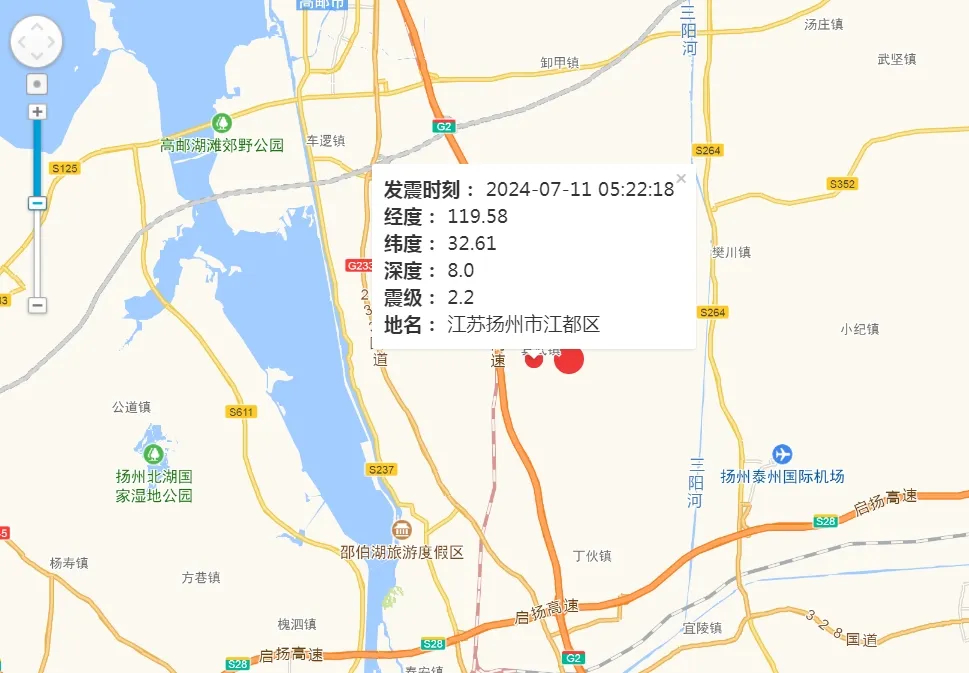 江苏地震台网测定,2024年07月11日05时22分18秒在江苏扬州市江都区(北纬32.61度,东经119.58度)发生2.2级地震,震源深度8千米。