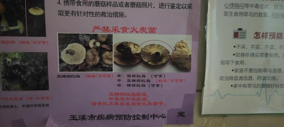 华宁县人民医院的急诊室门外,印有醒目“严禁采食火炭菌”字样的海报上,“火炭菌三兄弟”的“合影”清晰可见。三种火炭菌学名分别为密褶红菇、亚稀褶红菇和稀褶红菇,外形犹如“复刻”,但其中的亚稀褶红菇与另两种可食用火炭菌不同,有剧毒,且中毒死亡率极高。