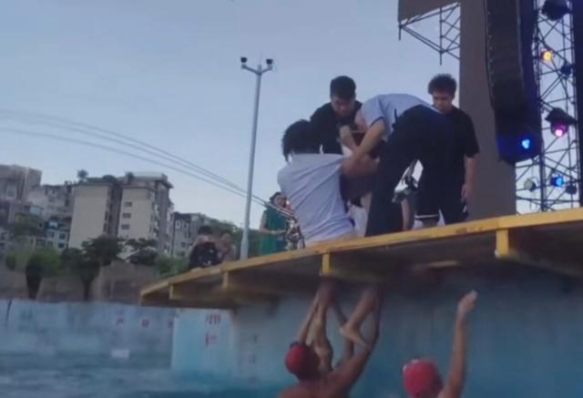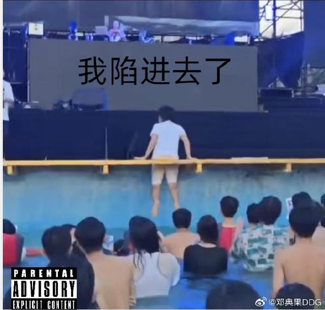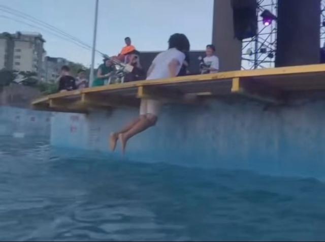 从现场视频中可以看到,音乐节的舞台搭建在大型泳池上,台下听众身穿泳衣,泡在水里,与台上的歌手进行互动。当邓典果往舞台边沿走去,试图距离观众更近时,他却踩在了排水槽上,刹那间掉下舞台,半个身体卡在了舞台中。随即,工作人员前来,将他拉了上来。