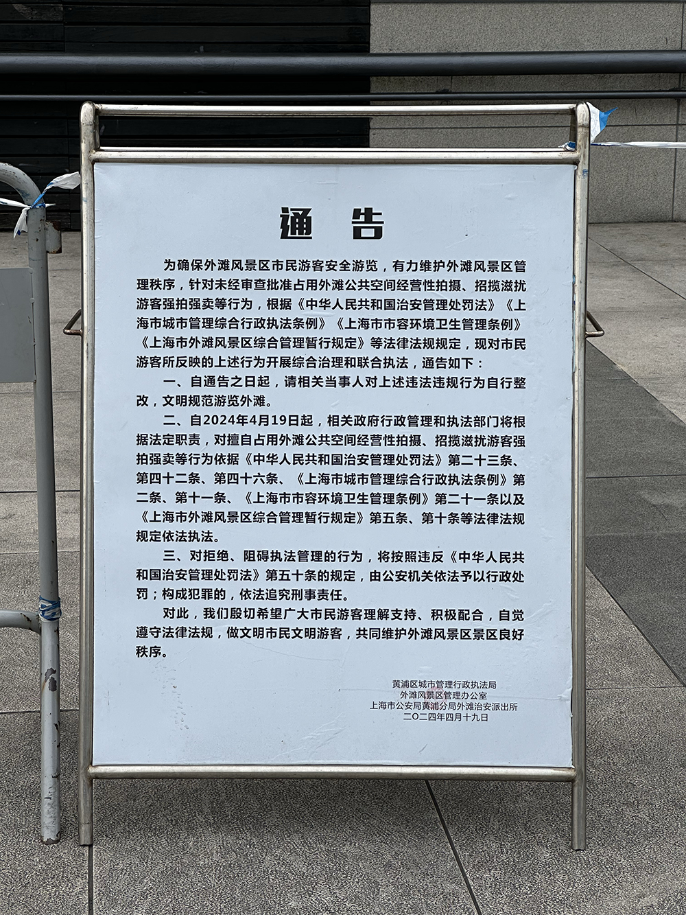 记者在一座警用瞭望台附近看到,地上放置有“针对未经审查批准占用外滩公共空间经营性拍摄、招揽滋扰游客强拍强卖等行为”的综合治理通告。该通告落款时间为2024年4月19日,由黄浦区城市管理行政执法局、外滩风景区管理办公室、上海市公安局黄浦分局外滩治安派出所联合发布,通告中载明了三部门综合治理、联合执法所依据的具体法律法规。