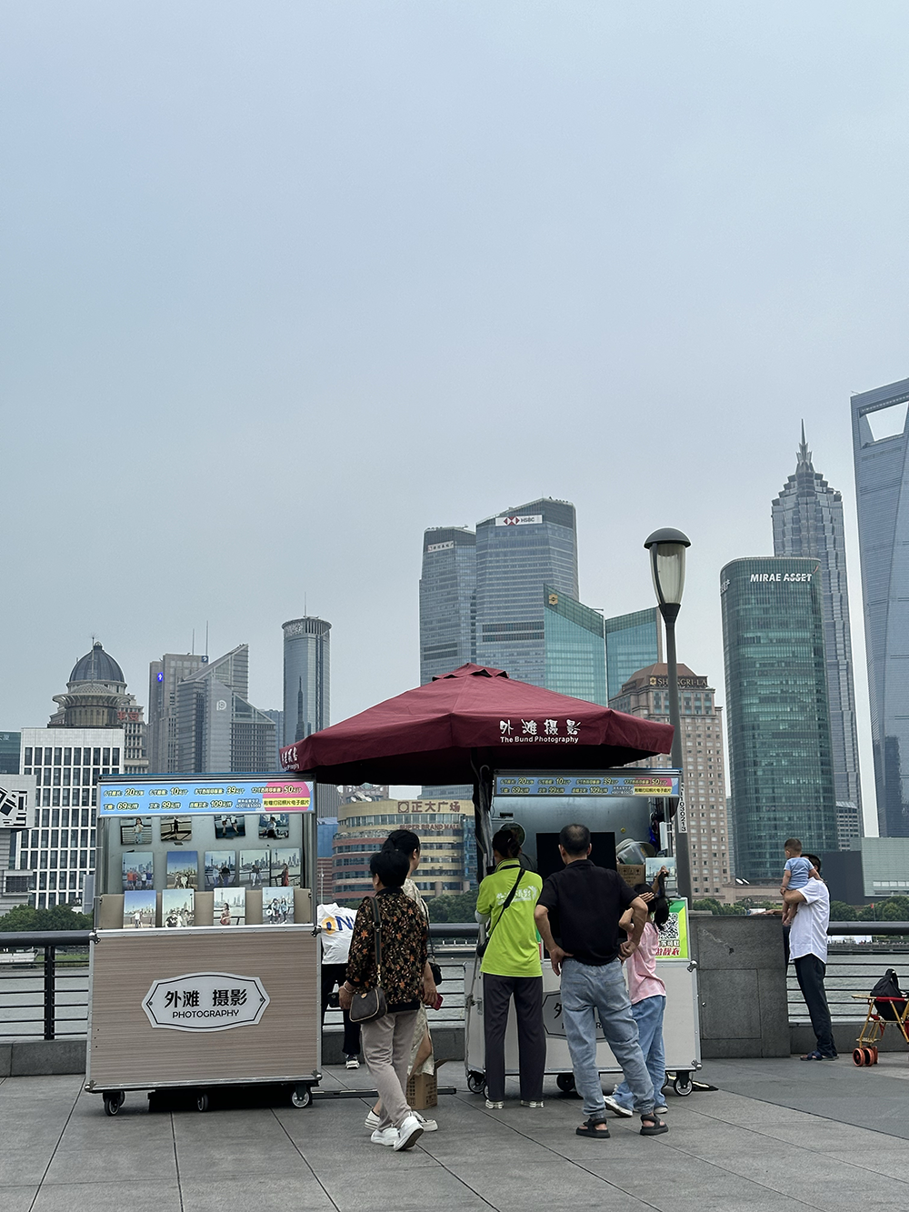 7月10日10时,记者来到外滩观景平台,在离台阶不远处,看到一个摄影摊点,摄影师和工作人员统一身穿印有“外滩摄影”的荧光色上衣,正在为游客拍摄和精修照片。