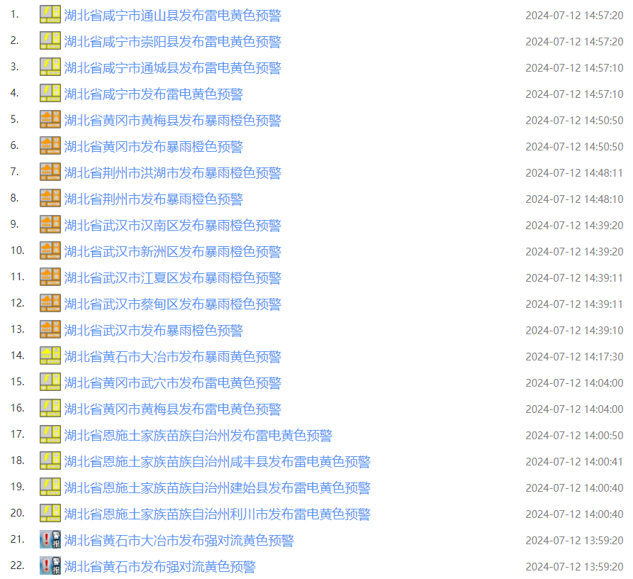 今天下午,武汉、黄冈、荆州等湖北多地发布暴雨橙色预警。黄石发布强对流黄色预警,黄石城区、大冶将出现雷暴大风、短时强降水等强对流天气。致灾风险高,请加强防范。
