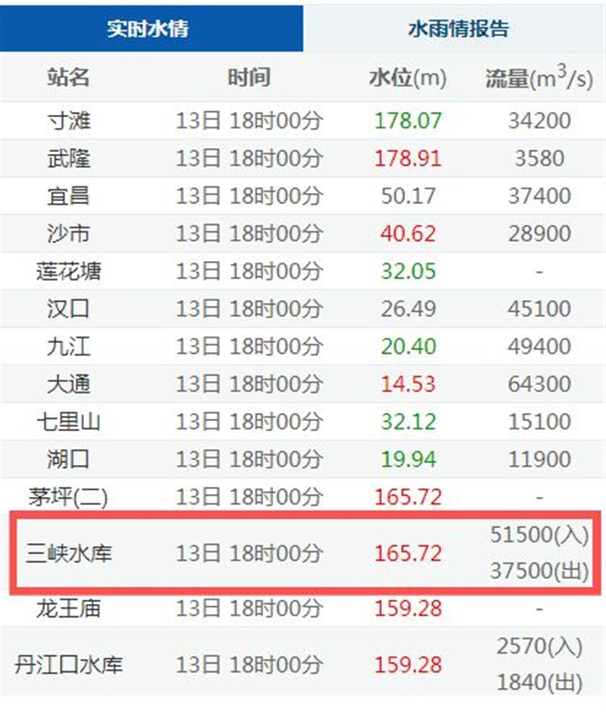 据介绍,当前三峡水库水位已拦洪运用至历史同期最高水位。极目新闻记者查询长江水文网发现,13日18时,三峡水库水位达165.72米,超汛限水位20.72米,入库流量51500立方米每秒,出库流量37500立方米每秒。