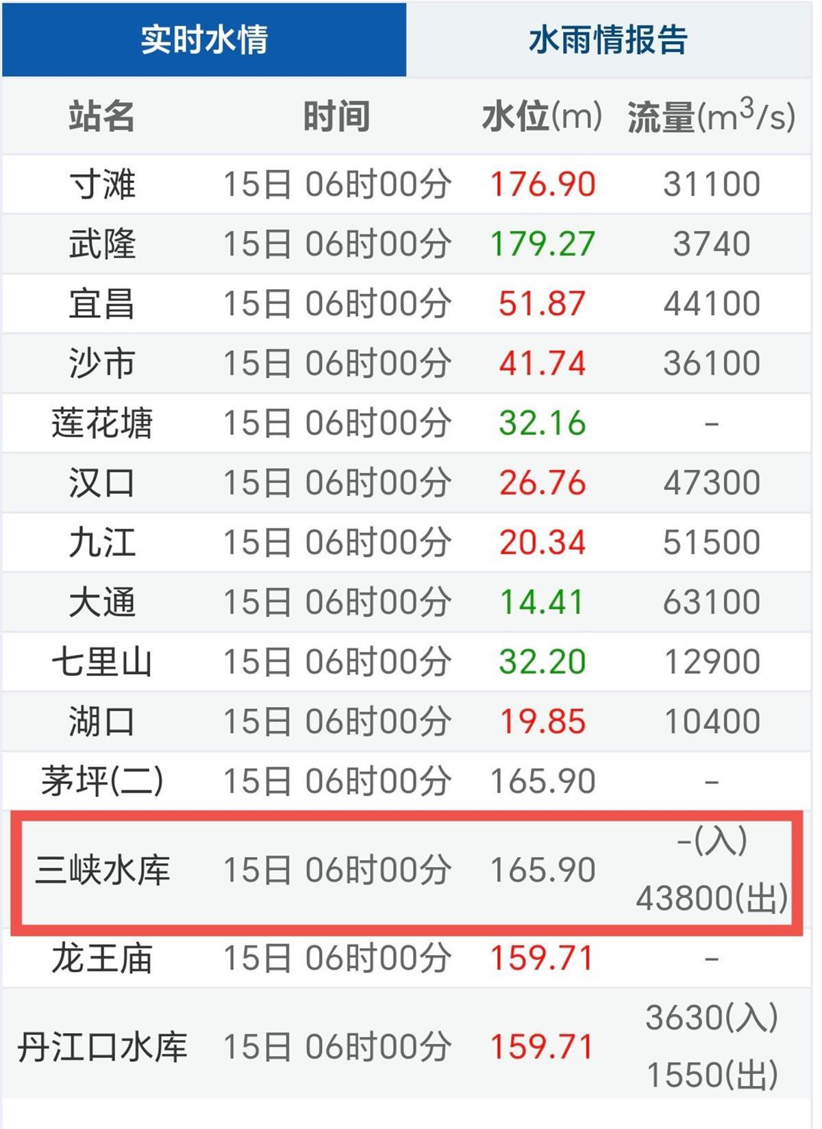15日6时实时水情(来源:长江水文网)
