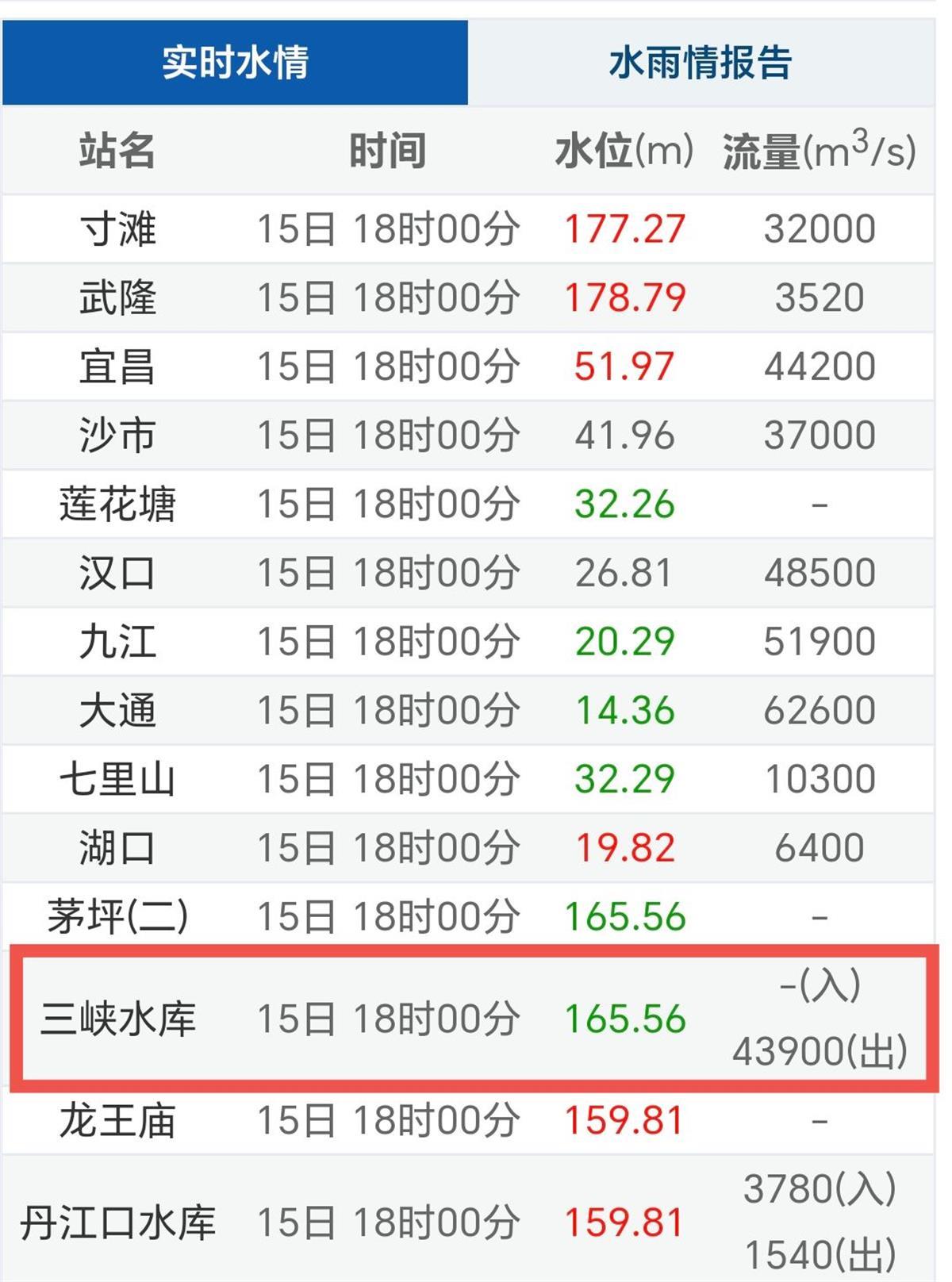 记者发现,15日6时,三峡水库水位已由14日的166米以上,降至165.90米;18时,三峡水库水位降至165.56米。期间,三峡水库维持约43000立方米每秒的出库流量,九孔泄洪。