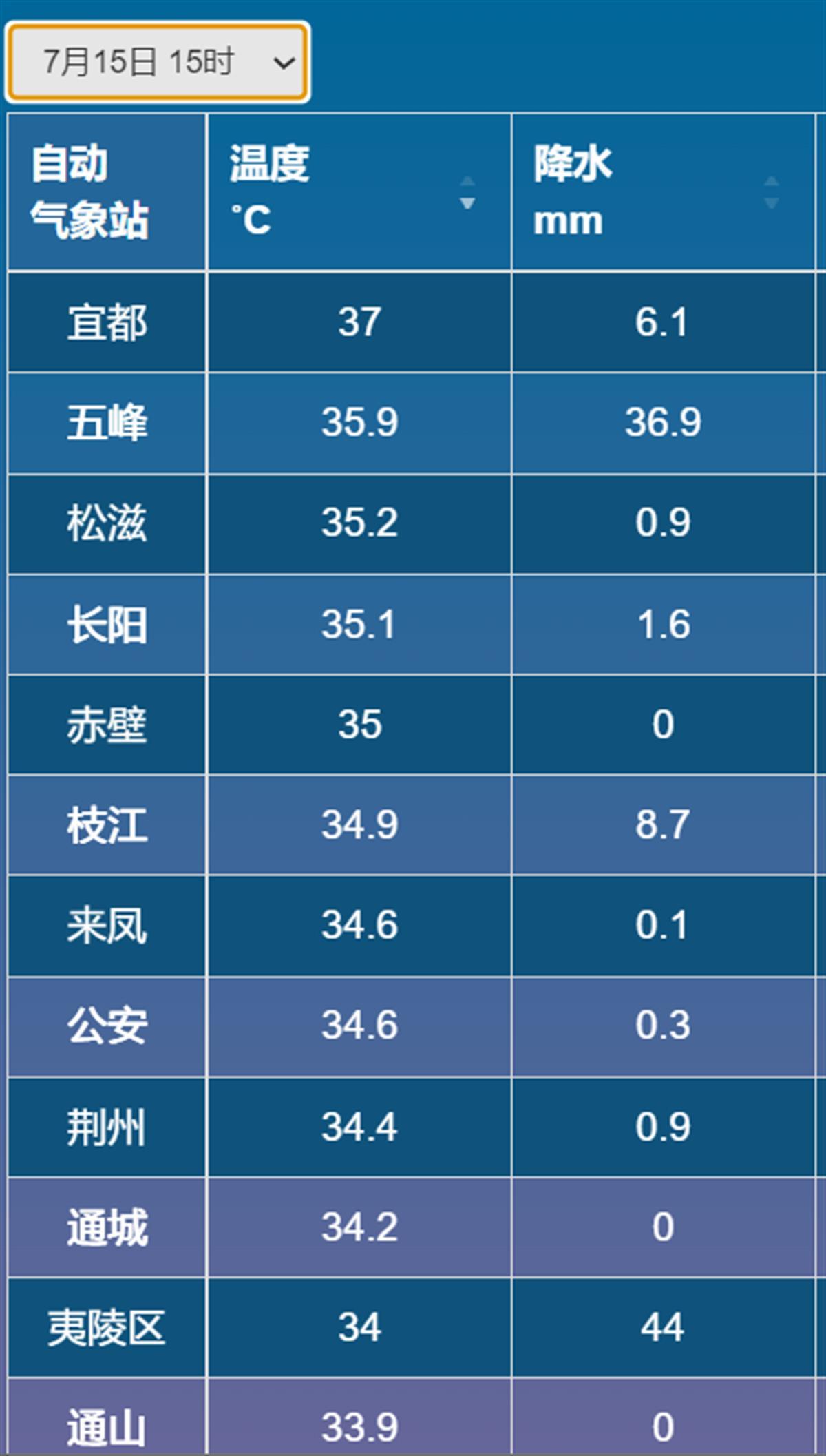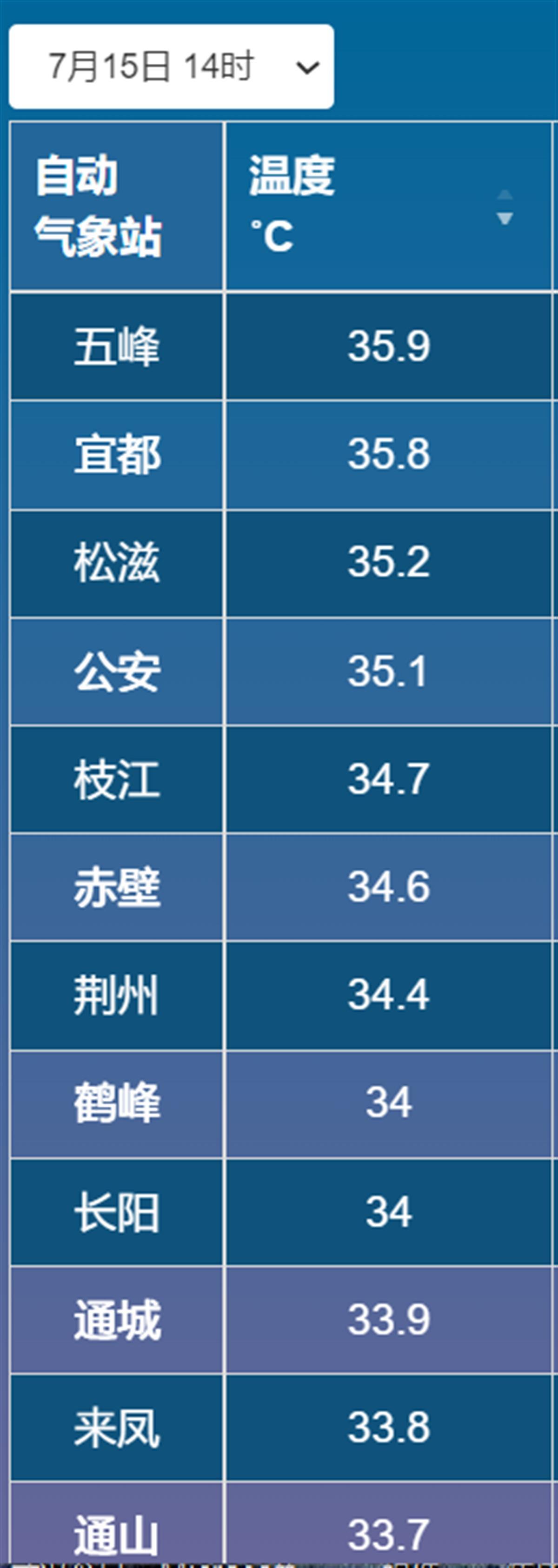 湖北全省来看,截至下午4时,全省仅8个县市出现35℃及以上的高温,主要集中在宜昌、荆州和咸宁地区,比如,宜都37.3℃,松滋35.2℃,五峰35.9℃,长阳35.1℃,赤壁35℃,公安35.1℃。