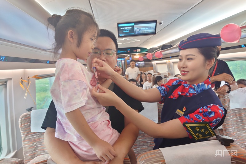 列车工作人员在与乘客互动(央广网记者夏莎摄)