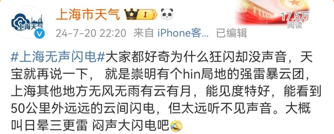 为什么狂闪雷却没声音,对于网友们的好奇,@上海市天气 解释了造成这样“奇观”的原因: