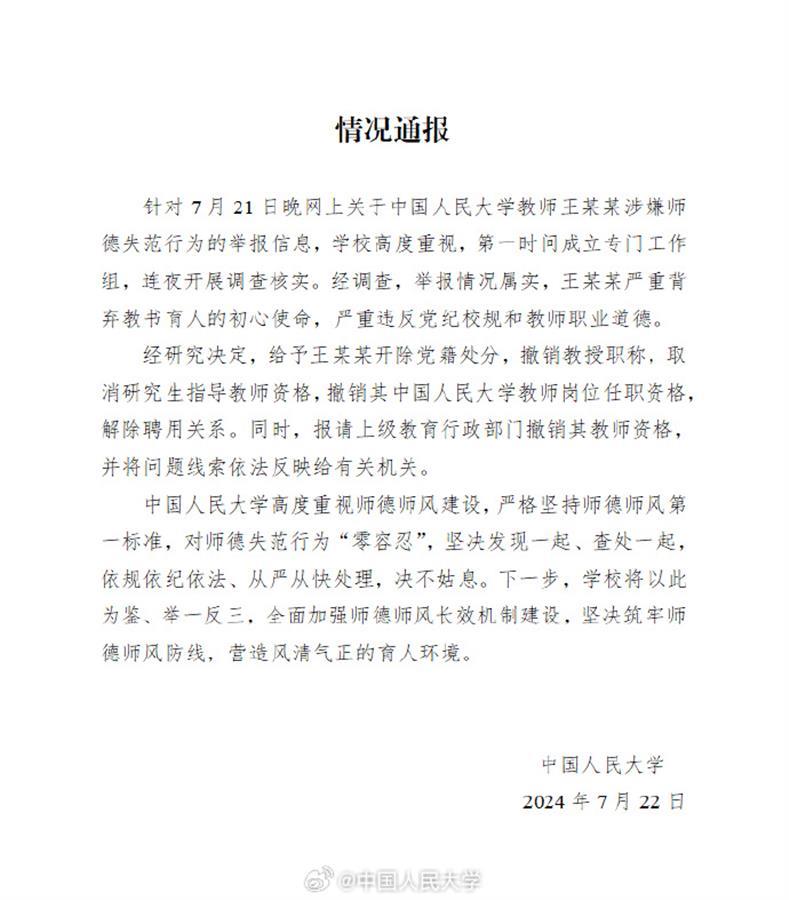 7月22日晚7时许,中国人民大学发布情况通报称,针对7月21日晚网上关于中国人民大学教师王某某涉嫌师德失范行为的举报信息,学校高度重视,第一时间成立专门工作组,连夜开展调查核实。经调查,举报情况属实,王某某严重背弃教书育人的初心使命,严重违反党纪校规和教师职业道德。