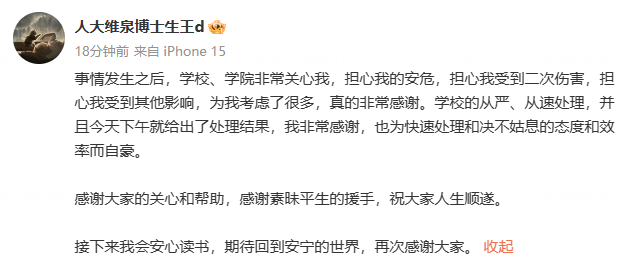 7月22日晚9时许,人大被博导性骚扰当事人再发博:事情发生之后,学校、学院非常关心我,担心我的安危,担心我受到二次伤害,担心我受到其他影响,为我考虑了很多,真的非常感谢。学校的从严、从速处理,并且今天下午就给出了处理结果,我非常感谢,也为快速处理和决不姑息的态度和效率而自豪。