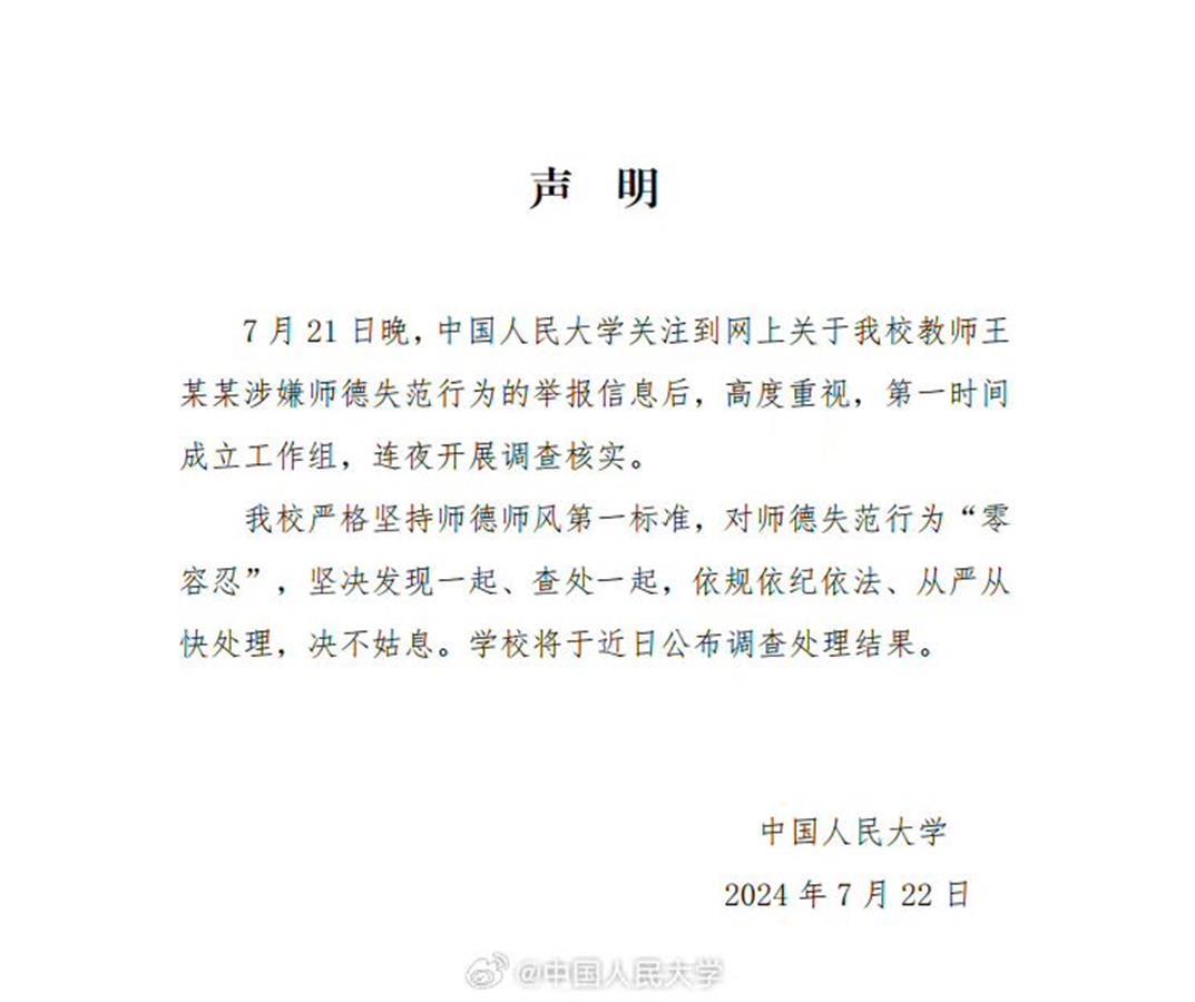 7月22日上午8时40分,中国人民大学官方微博发表声明称,已关注到该举报消息,将高度重视,第一时间成立工作组,连夜开展调查核实。该校严格坚持师德师风第一标准,对师德失范行为“零容忍”,坚决发现一起、查处一起,依规依纪依法、从严从快处理,决不姑息。学校将于近日公布调查处理结果。