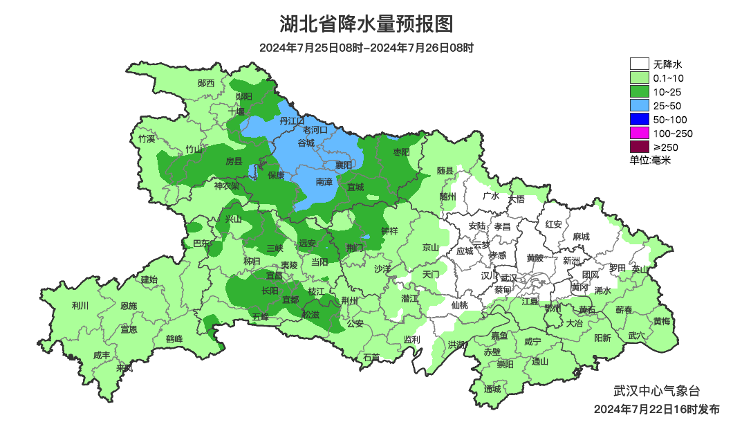 25日08时-26日08时,鄂西北、鄂西南北部多云转中到大雨,局地暴雨并伴有短时强降水、雷暴大风等强对流天气,其他地区多云有分散性阵雨或雷阵雨。最高气温35~38℃,最低气温25~30℃,偏北风2到3级转3到4级、阵风5到6级。