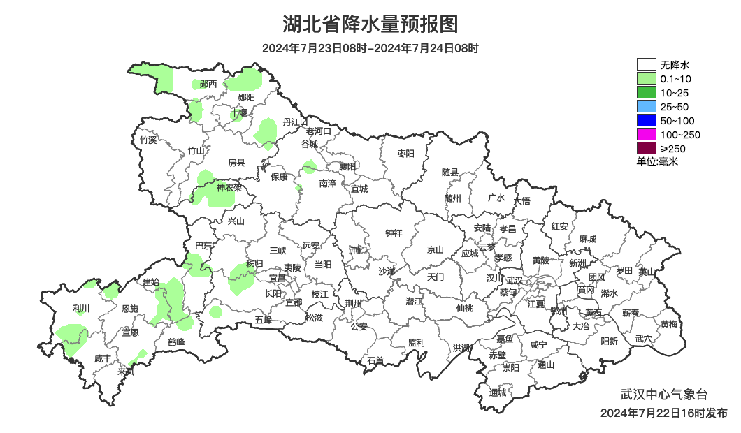 24日08时-25日08时,鄂西北、鄂西南多云有分散性阵雨或雷阵雨;其他地区晴天到多云,其中鄂东北东部、鄂东南局地有阵雨或雷阵雨。最高气温36~39℃、局地40℃以上,最低气温25~30℃,偏南风转偏东风2到3级。