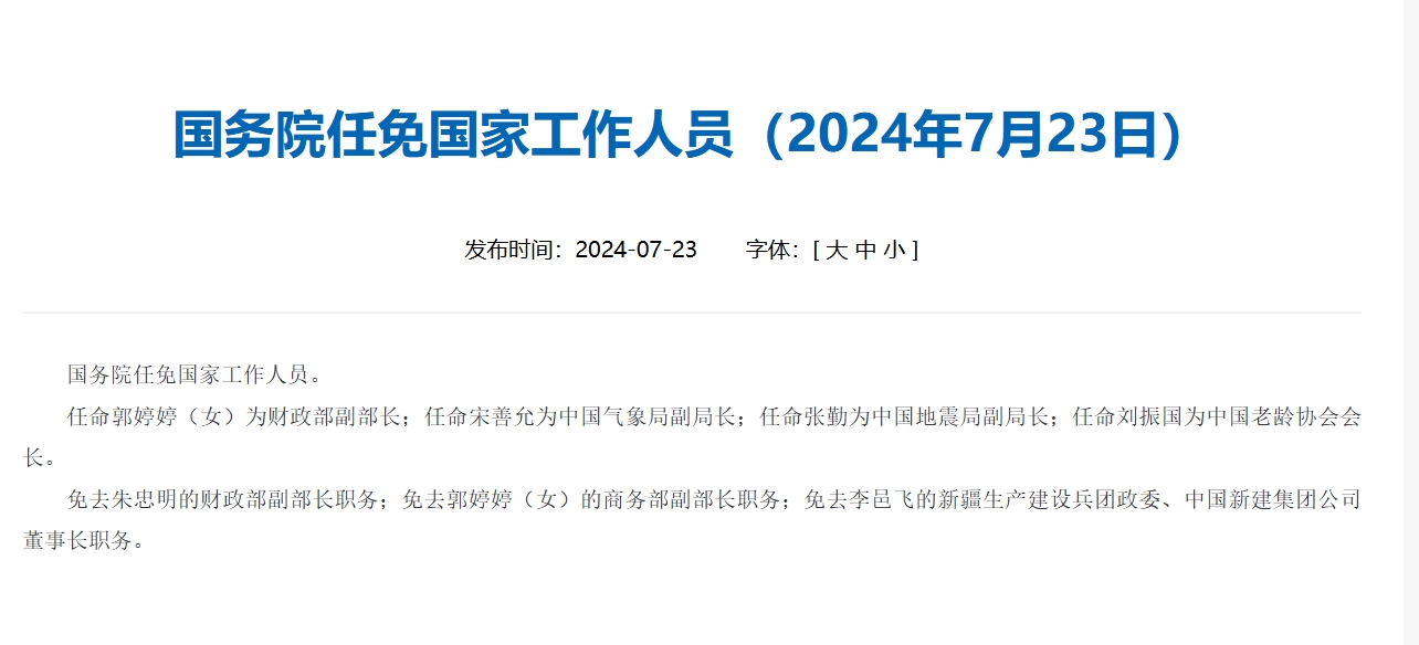 任命郭婷婷(女)为财政部副部长;任命宋善允为中国气象局副局长;任命张勤为中国地震局副局长;任命刘振国为中国老龄协会会长。