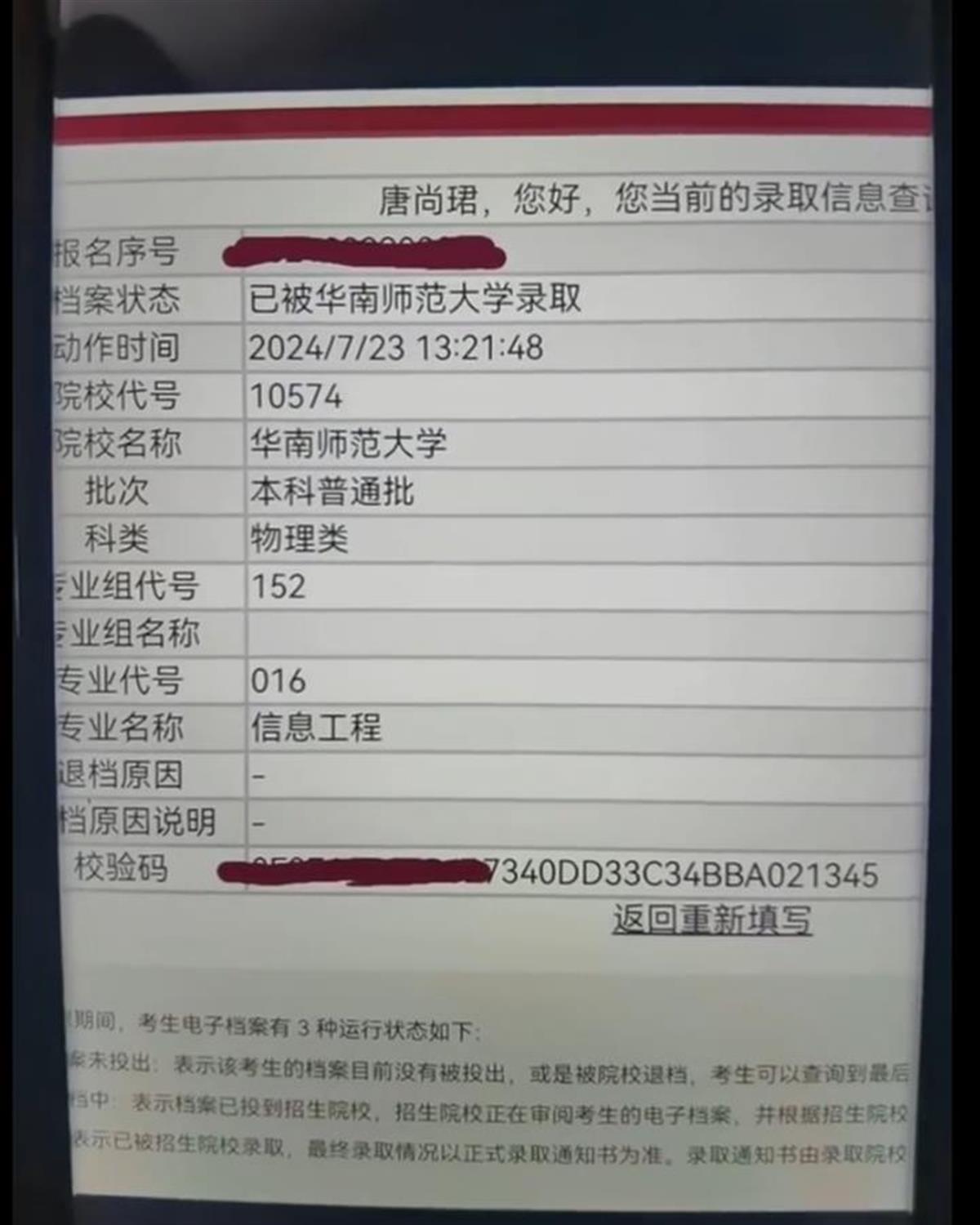 据此前媒体报道,7月22日上午,第16次参加高考的唐尚珺发布了查询志愿的视频。视频显示,唐尚珺目前已投档至华南师范大学。唐尚珺称,他之前填报华南师范大学志愿时,分别填报了化学、信息工程、环境科学、数学与应用数学四个专业。